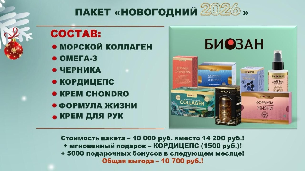 Стоимость пакета 10 000 руб. вместо 14 200 руб. Дополнительно вы получаете мгновенный подарок - КОРДИЦЕПС, стоимость которого 1500 руб. и подарочный бонус в следующем месяце 5000 руб.